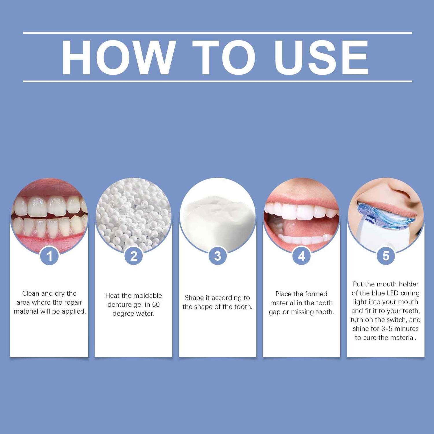 Our dental care set contains polyurethane. It quickly fills in tooth gaps and restores a confident smile with lifelike color. Simple operation, easy to self-learn and repair. Its application method is very simple: clean and dry the area where the repair material will be used. Heat the mold for the malleable prosthetic in 60-degree water. Shaped according to the shape of the teeth. Place the formed material between teeth or in the missing tooth space. Place the blue LED curing light mouthpiece in your mouth, stick it on your teeth, turn on the switch, and illuminate for 3-5 minutes to cure the material. And it can be made of safe materials, sturdy and durable, protecting oral health. Enhance your smile and exude confidence.