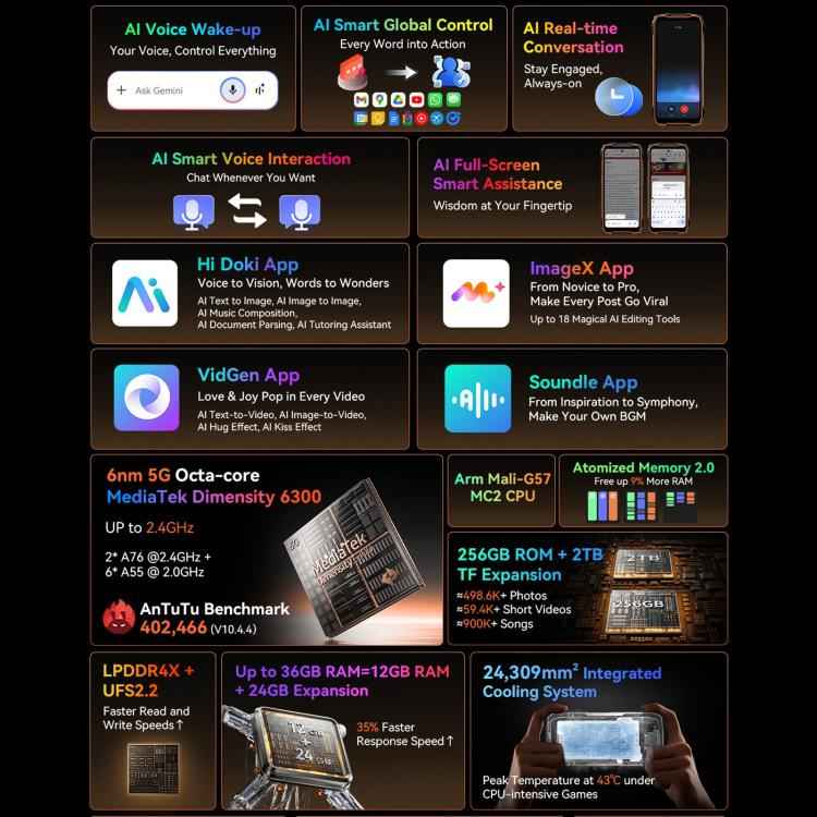 1. CPU: MediaTek Dimensity 6300, octa-core, ARM Cortex-A76 cores 2.4GHz x 2, ARM Cortex-A55 cores 2.0GHz x 6